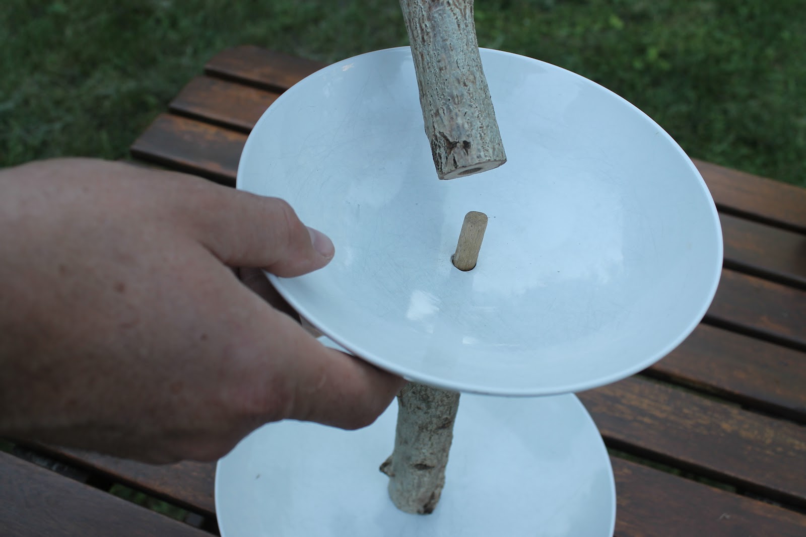 Ezután az ág tetejébe fúrjatok egy 10 mm átmérőjű, kb 5 cm mély lyukat. Illesszetek bele –egy kb 8-10 cm hosszúságú – 10-es tiplit, majd a középen átfúrt felső tányért húzzátok rá a tiplire.